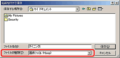 [名前を付けて保存]パネルが開くので、ファイルの種類を[画像ファイル(*bmp)]に切り替え、ファイル名を入力して[保存]をクリックします。