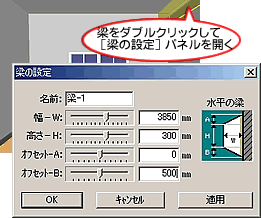 2.梁を配置し、ダブルクリックして[梁の設定]パネルを開きます。ここで、幅=3850mm(※)、高さ=300mm、オフセットB=500mmを入力してOKボタンを押します。