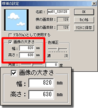 3DインテリアデザイナーPROで新規模様として画像を読み込み、「模様の設定」で、「画像の大きさ」をオンにし、「幅と高さ」を設定する。