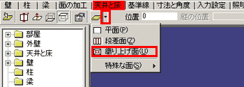[天井と床の設定]ボタン の横にある「▼」をクリックするとプルダウンリストが表示されますので、[織り上げ面]を選択します。
