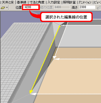 内側の[編集線]の1本を選択し、数値入力ボックスの[位置]に、先程確認した外側の位置の数値より10mm程手前の数値を入力します。