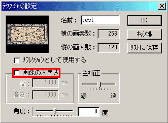 初期設定では繰り返し貼る方法となりますので、[テクスチャの設定]ウィンドウを開き、[画像の大きさ]のチェックを外してください。