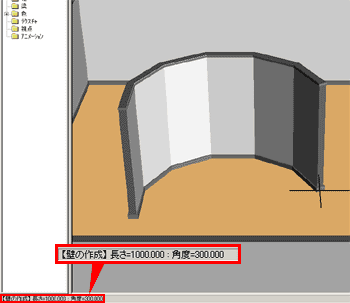 画面左下のステータスバーに表示される数値(長さ・角度)を確認しながら円弧状に壁を作成していきます。