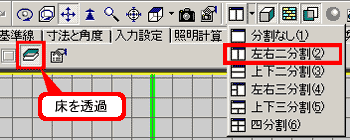 その際、画面を左右2分割の表示にしておき、さらにタブメニューの[入力設定]で[床を透過]にしておきますと、真上からグリッドを見ながら壁を入力できますので、比較的容易に作成することができます。