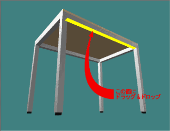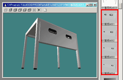 2.「KY事務机A017」の右図の面に「KY幕板A001」をドラッグ&ドロップします。 ドラッグ&ドロップをしたパーツ「KY幕板A001」を選択してからタブメニューから[位置]を選択し、位置の調整をします。