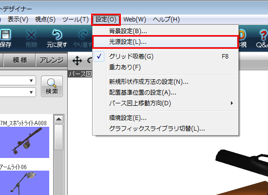 [設定]メニューの[光源設定]を選択します。