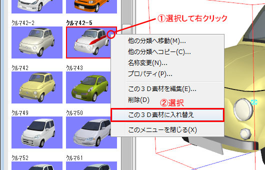 3D素材パレットから、入れ替えたい3D素材を選択して右クリックし、[この3D素材に入れ替え]を選択します。