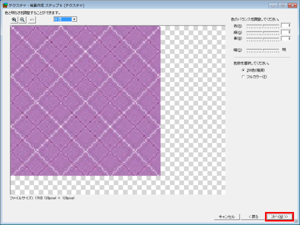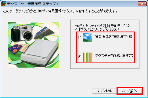 表示された[テクスチャ・背景作成 ステップ1]で、作成する種類を選択して[次へ]をクリックします。