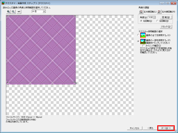 [テクスチャ・背景作成 ステップ3]で、利用する画像の使用範囲を選択します。