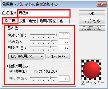 [基本色]タブで、[色合い]や[色み]、[明るさ]などを編集します。