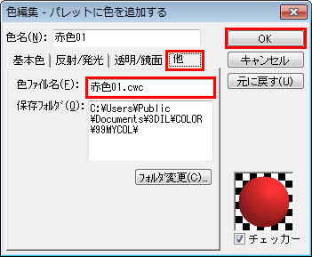 [他]タブに切り替え、[色ファイル名]が、「色名.cwc」になっていることを確認して[OK]をクリックします。