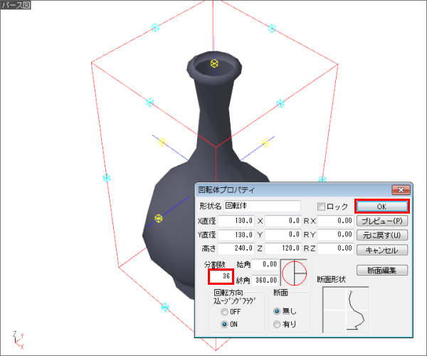 形状作成ツールの[円柱・円錐]や[球]、[回転体]で作成されている3D素材は、ファイルが大きくならないように回転方向に対する分割数を低く設定しています。 そのため、3D素材の大きさ(パース図での見え方)によっては、角ばったように見えます。 その角を滑らかにする方法です。