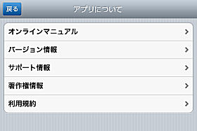 情報ボタンをタップして「アプリについて」画面を開きます。