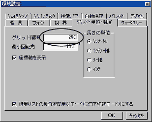 「その他」メニューの「環境設定」にある「グリッド・単位・階層」タブを選択し、グリッド間隔を4分の1(デフォルトでは1000ミリメートルになっているので250ミリメートルにする)にして「OK」ボタンを押します。そして、ツールバー