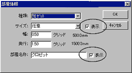 | 2. | 畳数を非表示にしたい場合は「サイズ」、部屋の名称を非表示にしたい場合は「部屋名称」の右にある「表示」のチェックを外してOKをクリックします。 |