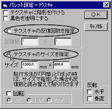 | テクスチャパレット左側の「その他設定」ボタンを押し、「パレット設定−テクスチャ」ダイアログボックスを表示します。下記のとおり、反復回数かサイズを指定して、「OK」ボタンを押した後テクスチャを貼り付けます。 | ![]() |
