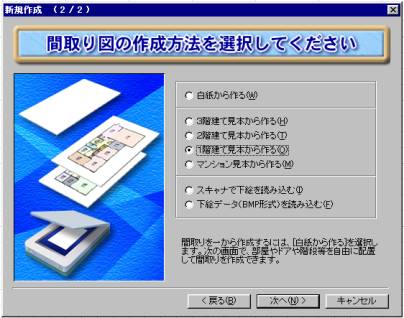 メインメニューの「間取りから作る」−「新規作成」をクリック「新規作成2/2」で「1階建て見本から作る」を選択します。