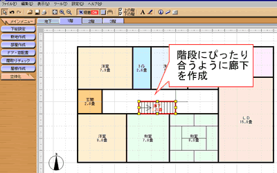 まず、一つ目は「部屋作成」ナビの「廊下」から階段の大きさに合わせて作成します。