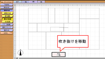 「2階」タブでフロアを切替え、「吹抜け」を一階の間取りに重ならない位置に移動します。