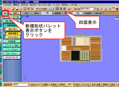 次に、 「新規形状パレット表示」ボタンをクリックして新規形状パレットを表示し、作業がしやすいように四面図表示にします。