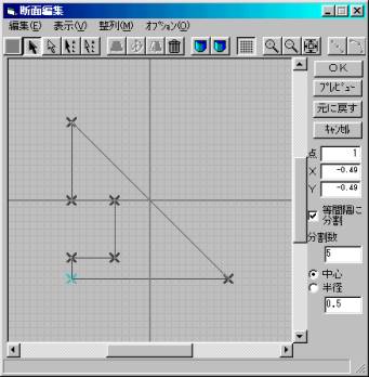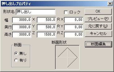 作成した形状をダブルクリックし[押し出しプロパティ]ウィンドウを表示し、断面を「有り」にし、断面編集ボタンを押します。