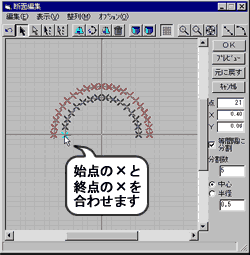 どのように描いても結構ですが、この上図のように、半円をまず均等な四角で描いておいて、選択し、画面右上部の「円弧に並べる」ボタンを押し、中心線をクリックするときれいな半円が描けます。 |