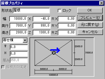 「プレビュー」ボタンを押して、「正面図」で確認してみます。先に作った切り妻屋根の右側の斜面と同じ角度になるように調整します。 微妙な値は「W」に数値を直接入力し調整します。 このとき、「H」の値が0のままにしておきます。角度が同じになったら「OK」ボタンを押します。
