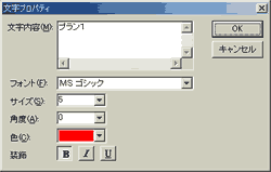 [文字プロパティ]が表示されますのでここで文字を入力し、フォントの種類、サイズ、角度、色、装飾を設定してOKボタンをクリックします。