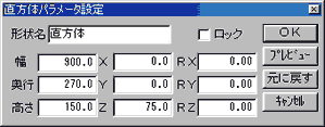 | 3. | 作成した直方体のサイズ、位置を調整します。 直方体を選択してメニューの[編集]−[形状編集/配置]を選択すると、[直方体パラメータ設定]ウィンドウが表示されますので下記のとおりサイズと位置を設定してください。 |