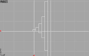 | 8. | 3段目から6段目までのコピーが終わりました。 位置はこのままでいいので、直方体の大きさを変更します。 側面図(横から見た図)で3段目の直方体をクリックし選択状態にします。 直方体を選択してメニューの[編集]−[形状編集/配置]をクリックします。 [直方体パラメータ設定]ウィンドウが表示されますので下記のとおりサイズと位置を設定して ください。 3段目の設定が終わりましたら同じように4段目から6段目も下記のように設定してください。 |