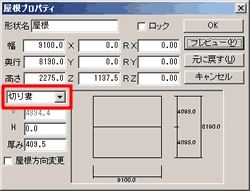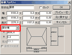 屋根形状の設定や、棟の形状などは[屋根プロパティ]で設定します。