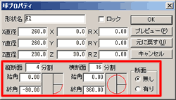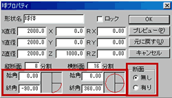 球はプロパティウィンドウで[縦断面]・[横断面]・[断面]を編集することで、さまざまな形状を作成することができます。