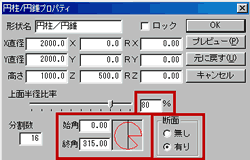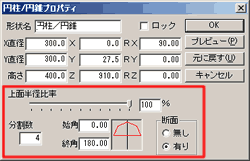 プロパティウィンドウで[上面半径比率]・[始角、終角]・[断面]を編集することで、さまざまな形状を作成することができます。