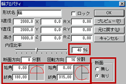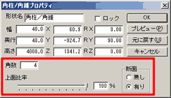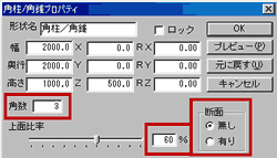 プロパティウィンドウの[角数]・[上面比率]・[断面]を編集することで、さまざまな形状を作成することができます。