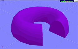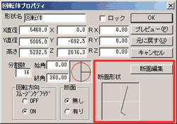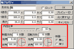 ドーナツ状の形状や、取っ手等を作成する時に使用します。[輪プロパティ]の[内径比率]・[断面方向]・[回転方向]・[断面]を編集することで、さまざまな形状を作成することができます。