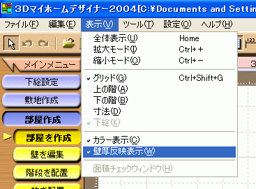 表示メニューの「壁厚反映表示」のチェックをはずします。