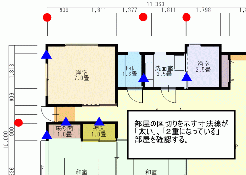 上下左右に表示される寸法線を確認し、線が太い箇所や重なっている箇所の部屋を確認します。