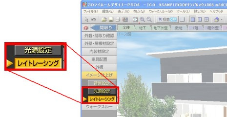 パース図に表示される色や模様は、簡易表示を行っており正確には表示していません。これは操作性を高めるためです。 3D空間での色は、光の当たり具合によって変わります。 壁に光が当たっている状態を想像してみてください。色としてはまったく同じ白い壁でも、強く光が当たる部分は白く、影の部分は少し黒っぽく見えるはずです。 コーナー部分や、柱が立体的に見えるのは、光の当たり具合が違うため明暗の差ができ、見た目の色が面ごとに違うためです。 3D空間で立体感を表現するには「光」の要素が不可欠なのです。