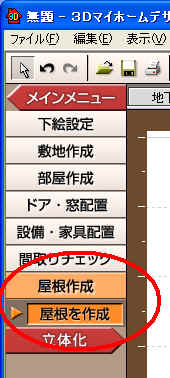 - 間取り画面のナビゲーションパレットから[屋根作成]を選びます。