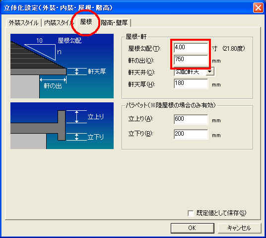 - [屋根]タブをクリックし、「屋根勾配」と「軒の出」を設定します。画像