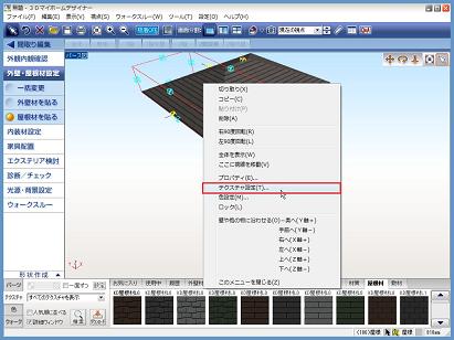 [テクスチャ設定]ウィンドウを閉じて、ナビ[外観・屋根材設定]の[屋根材を貼る]を選択して元の階層に戻ります。