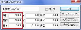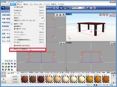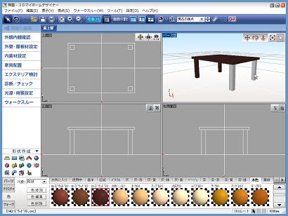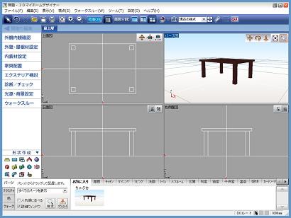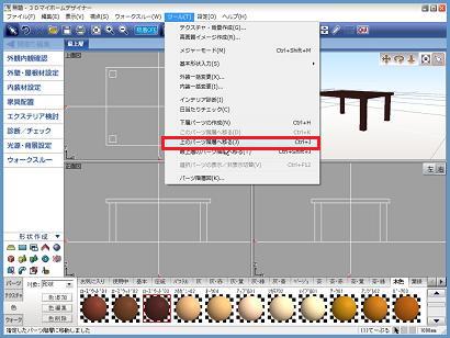 形状作成ツールでパーツを作成します(⇒形状作成ツールについてはこちらを参照)。 ここでは [ 床・天井 ] で天板を、[ 直方体 ] で脚を作成して、色パレットから色をつけています。 天板の設定例 脚の設定例