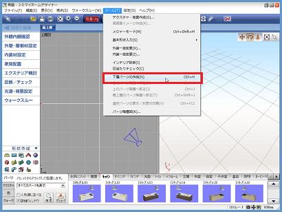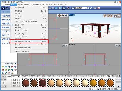 パーツの配置基準点を設定します(⇒配置基準点についてはこちらを参照)。 パーツを選択して、メニューの [編集] から [ パーツ配置基準点設定 ] を選択します。[ パーツ配置基準点設定 ] ウィンドウで、[ 左右方向(X軸) ] を [ 中心 ] 、 [ 前後方向(Y軸) ] を [ 中心 ] 、 [ 上下方向(Z軸) ] を [ 下端 ] に設定して [ OK ] をクリックします。