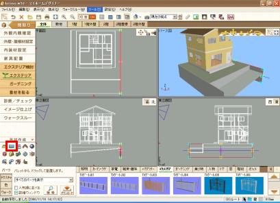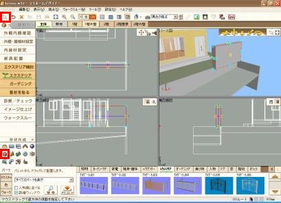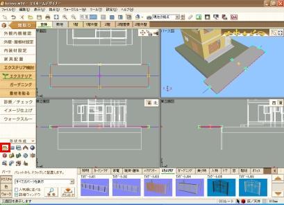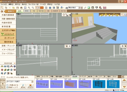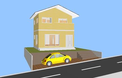 ここでは敷地より低くて傾斜のある駐車スペースを以下の手順、ツールで作成します。 (1)前面の壁を[壁]ツールで作成 (2)駐車スペースの床面を[床・天井]ツールで作成 (3)左右の側面の壁を[壁]ツールで作成 (4)階段を[直方体]ツールで作成 (5)道路パーツ、車パーツを配置 (6)テクスチャを貼って仕上げ