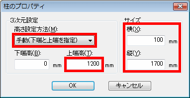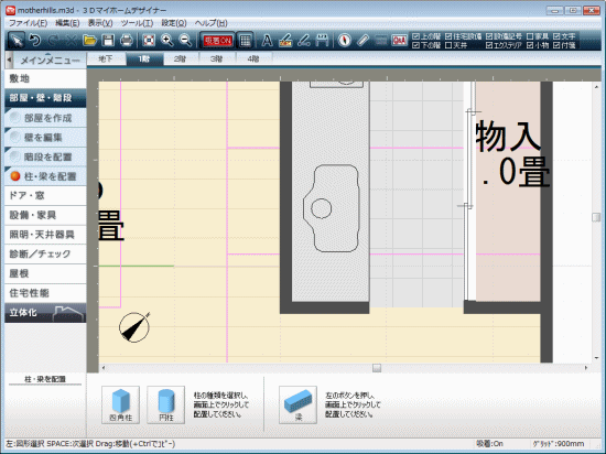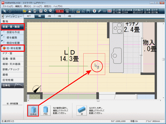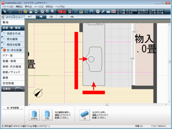 部屋に仕切り壁や袖壁などの一枚壁を作成するときは、間取り画面で「柱」を配置してサイズを変更します。