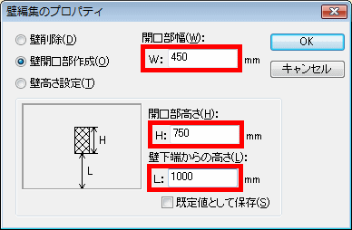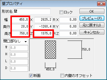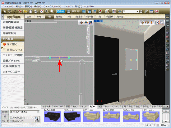 部屋にニッチを作成する一番簡単な方法は、あらかじめ間取り画面で壁編集の「壁開口」で開口部を作成しておき、立体化してから形状作成ツールの「壁」で開口部をふさぐ壁を作成してはめ込みます。