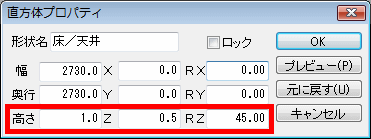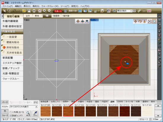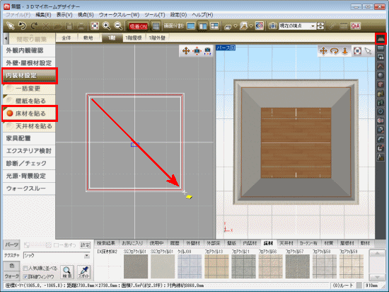 テクスチャを貼り付ける際、基本設定として「0度」「90度」「180度」「270度」の角度でしか貼ることができません。 ここでは形状作成ツールを利用して、任意の角度で床材を貼り付ける方法をご紹介します。