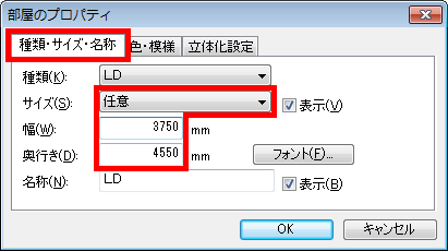 表示された[部屋のプロパティ]の[種類・サイズ・名称]タブで、[サイズ]を「任意」に切り替えます。