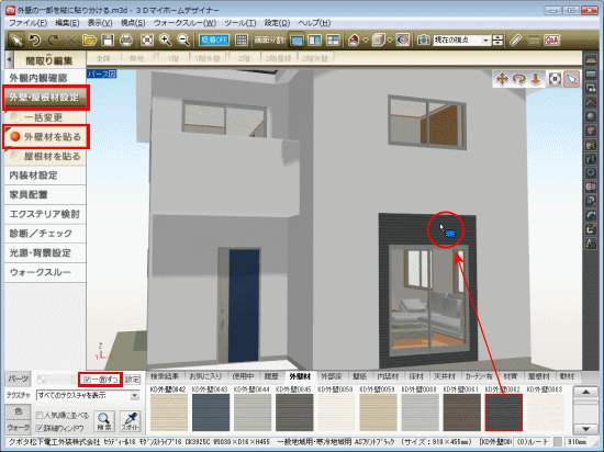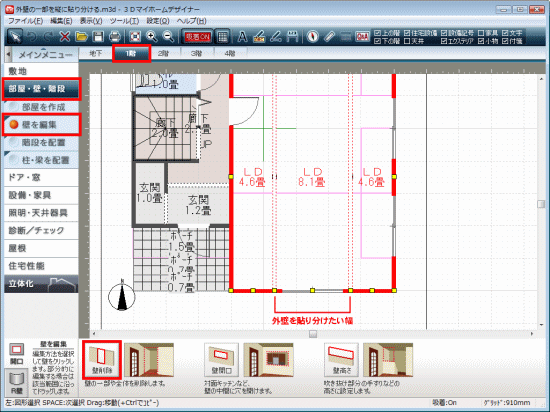 「一面ずつ」のチェックをオンにして外壁にテクスチャを貼り付けると、壁一面ずつにテクスチャを貼り付けることができます。 この外壁の「一面」は、間取り画面で作成した部屋のサイズで分けられます。 そのため、2階建の建物で1階から2階まで同じ幅のテクスチャを貼り付ける場合は、間取り画面で部屋を作成するときに1階と2階で部屋を同じ幅で分割して作成します。