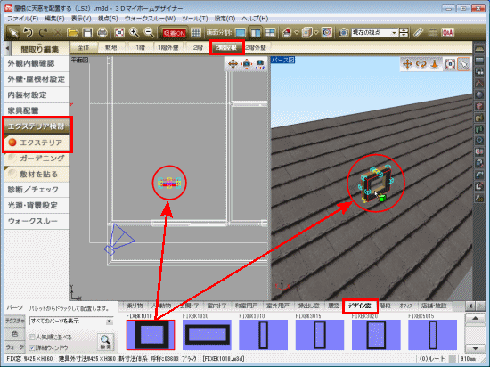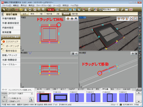 屋根に天窓用のパーツを配置する方法です。天窓用のパーツは、FIX窓を利用します。